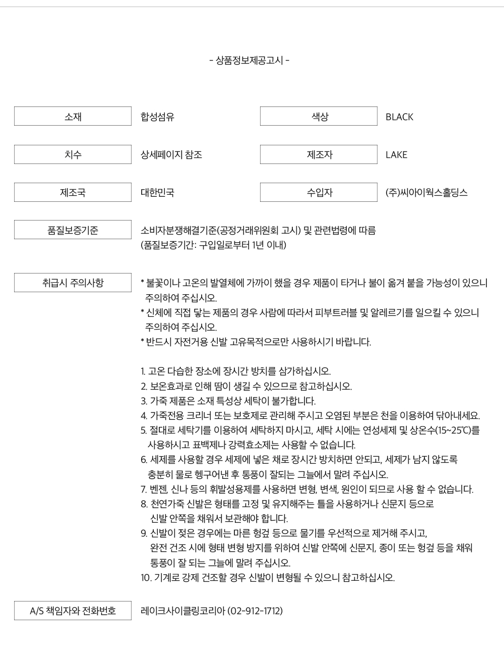 LAKE 사이즈 표