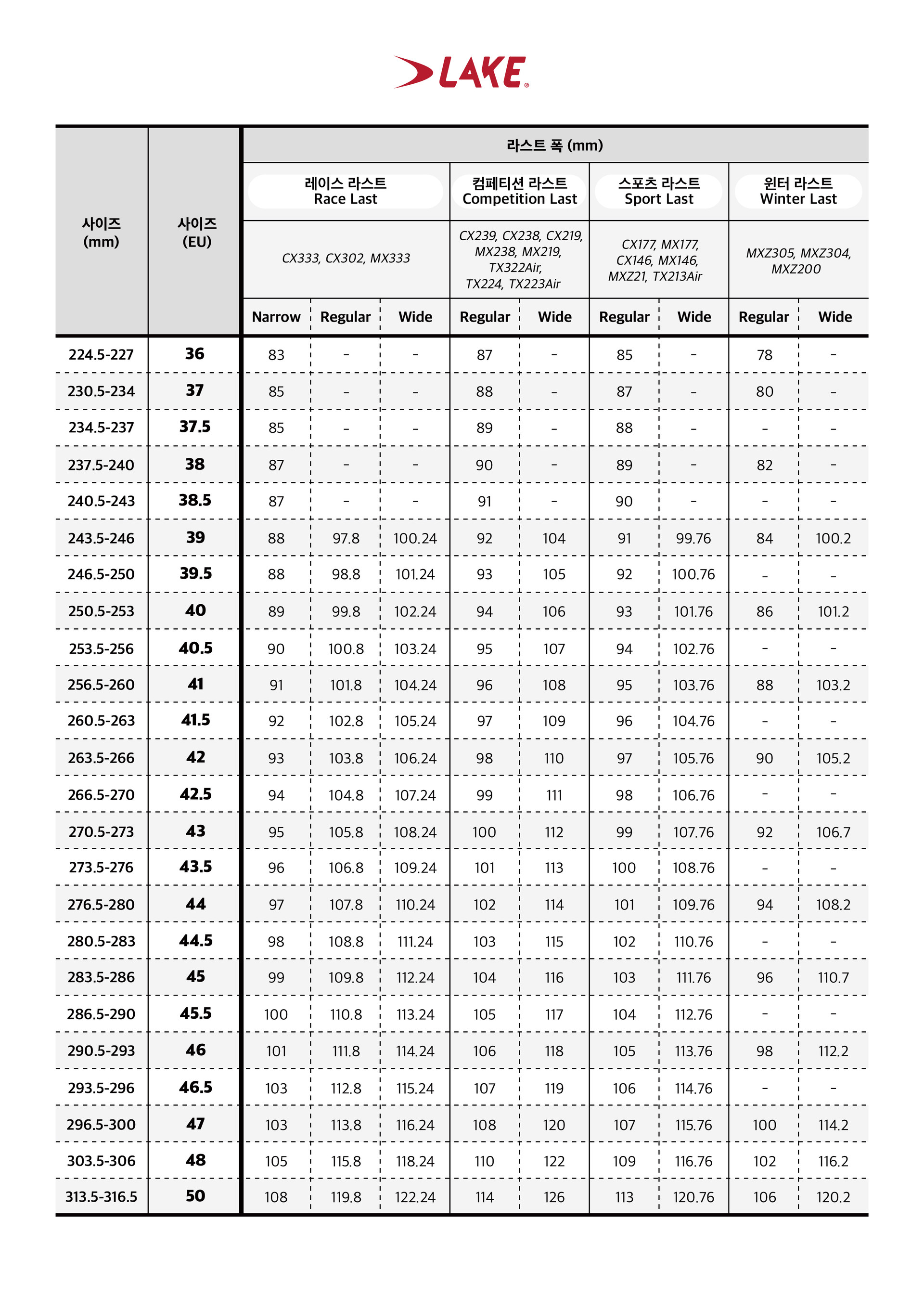 레이크의 클릿슈즈는 어떤 모델인지에 따라 라스트가 달라지고, 라스트에 따라 폭(발볼 너비)이 달라집니다. 원하시는 모델의 너비와 길이를 다음 차트를 통해 참조하세요.